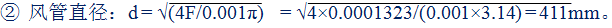 ③ 風(fēng)量:Q1 = F1×L = F1×vt = πd²vt/4 = 3.14×0.411×0.411×35×3600/4 = 16708m³/h。