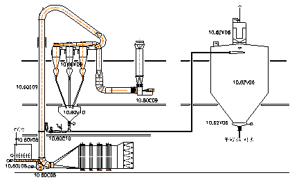 ⑶ 離心風(fēng)機(jī)正壓吹送是稀相輸送,主要是設(shè)計(jì)好輸送風(fēng)量、固氣比、風(fēng)壓、輸送管道直徑、卸料旋風(fēng)分離器。輸送量為16.67t/h,風(fēng)速為35m/s,物料密度為0.1%。