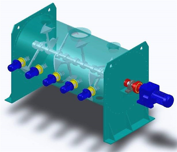 臥式筒體由鋼板卷制而成,作盛物料用,筒體上開有若干孔,供進出料,觀察用。犁刀軸支承座固定在筒體二端的蓋板上。